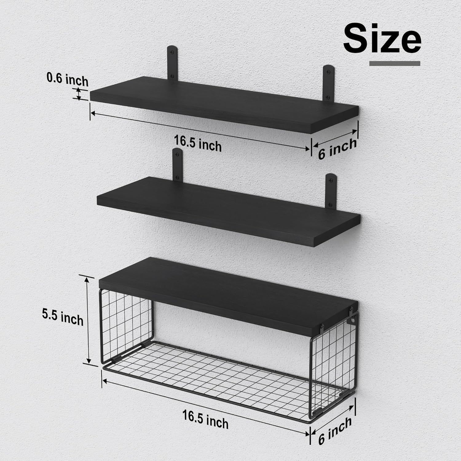 2.2-in-1 Floating Shelves with Toilet Paper Basket - The size of the floating shelves basket is 16.5*6*5.5 inches, which can store 3 rolls of toilet paper, other small objects, and towels. Our storage basket of bathroom floating shelves is made of iron wire with a powder-coated finish, which is more solid and won’t rust. It fits the humid environment. These wall-mounted floating shelves with a grid design will reduce dust accumulation, and keeps the toilet paper clean and dry.