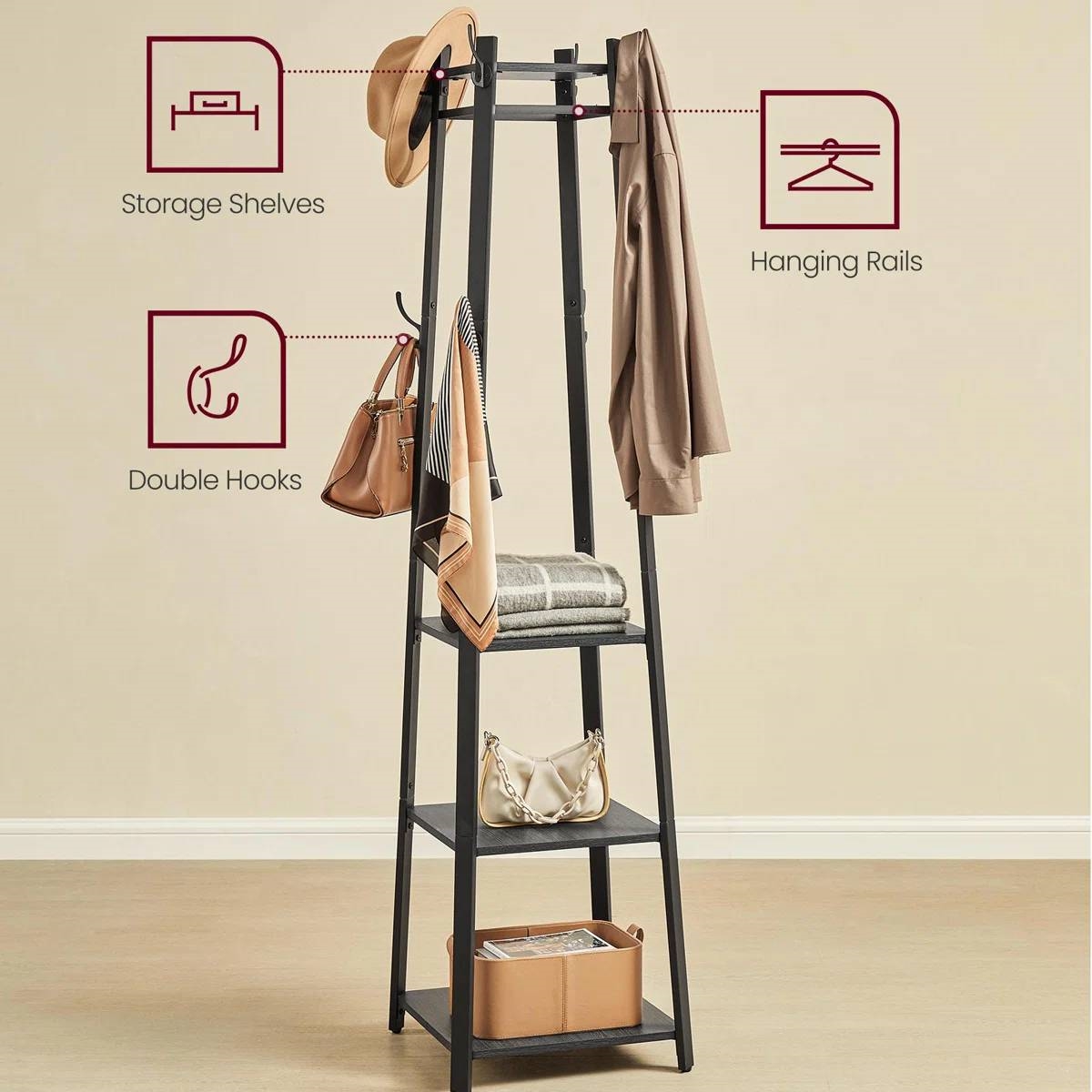 • Innovative & Stable Design: With the sides tapering in slightly toward the top, the matte-black iron frame gives this coat rack more than just a unique shape; it also provides stability and firmly supports the three shelves.