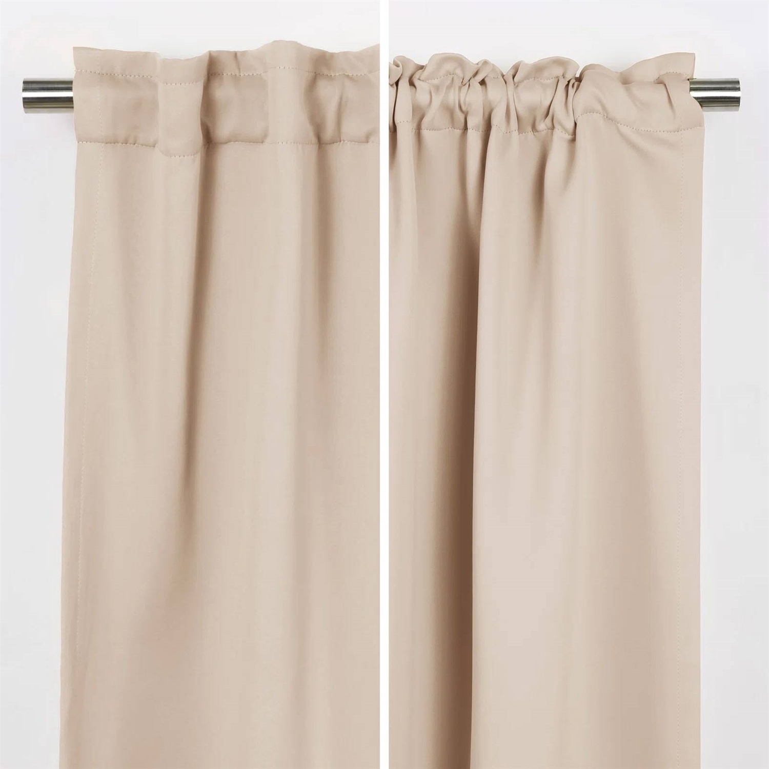Frame your French doors to the patio with these 52 x 96 inch Solid Beige Cream Thermal Blackout Curtain Panels - Set of 2, showcasing a solid hue and rod pocket design. The blackout design is perfect for keeping the sun at bay, so you can enjoy sleeping in on Sunday mornings or catching a mid-day nap in the den. Note: Actual product color may vary from the images shown on-site. Every monitor or mobile display has a different capability to display colors, and every individual may see these colors differently. The darker colors are more effective in blocking out light and the lighter colors are less effective. White/Light colors are for room darkening.