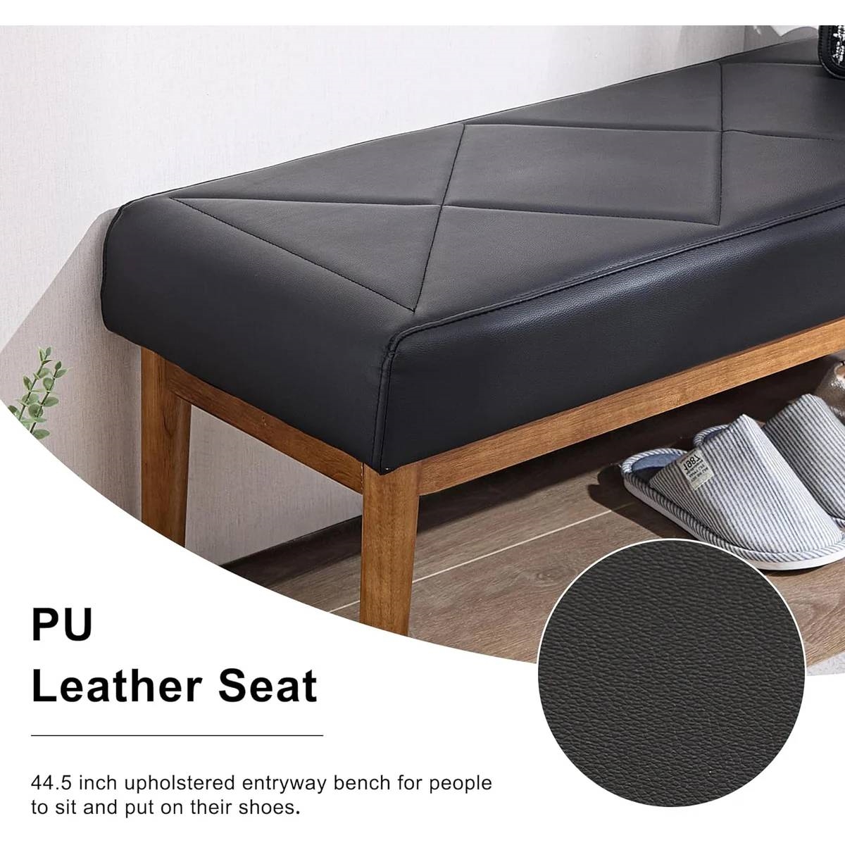 Modern Black Faux Leather Bench with Wood Legs - Bedroom Entryway Living Room
