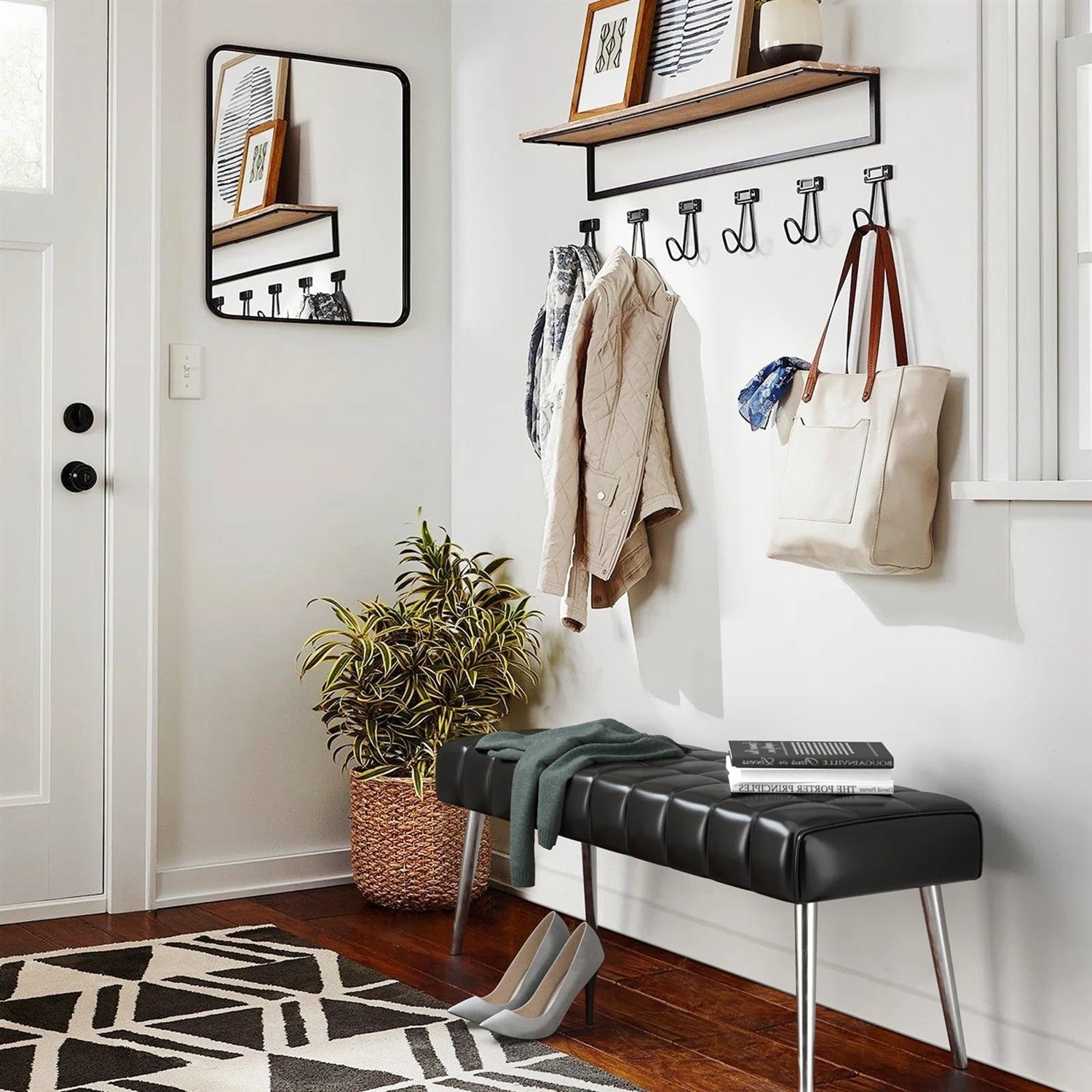 Revamp your home's aesthetic with this Mid-Century Modern End of Bed Bench with Black PU Leather Seat and Tapered Legs that exude refined charm. Its antique styling brown legs and tufted seat create a clean, sophisticated look that will elevate any space. Its sturdy seat that can hold significant weight. The rectangular seat is filled with high-density foam to provide ample support for comfortable sitting. These Mid-Century Modern End of Bed Bench with Black PU Leather Seat and Tapered Legs are versatile and can complement any interior decor, whether modern, elegant, casual, or rustic.