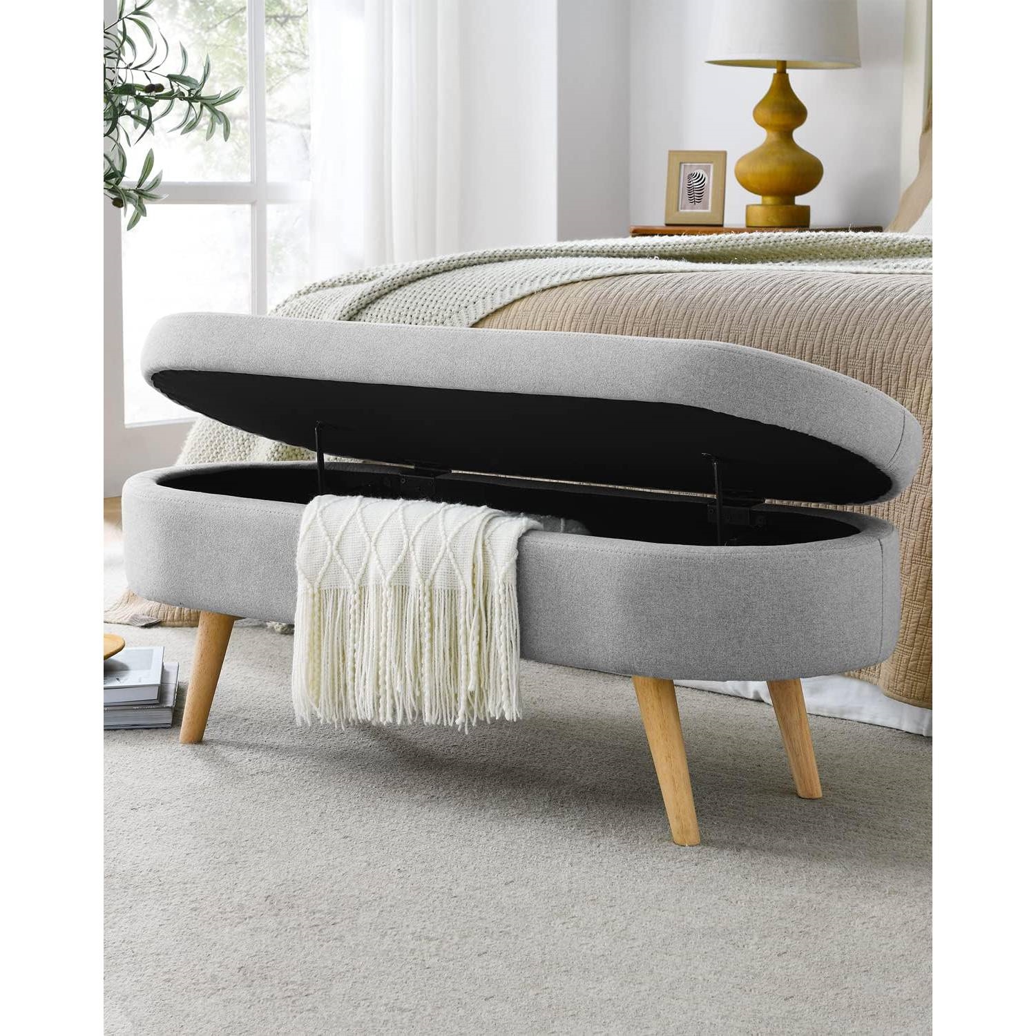 • Mid-Century Modern Boho Style Grey Linen Bedroom Storage Bed Bench