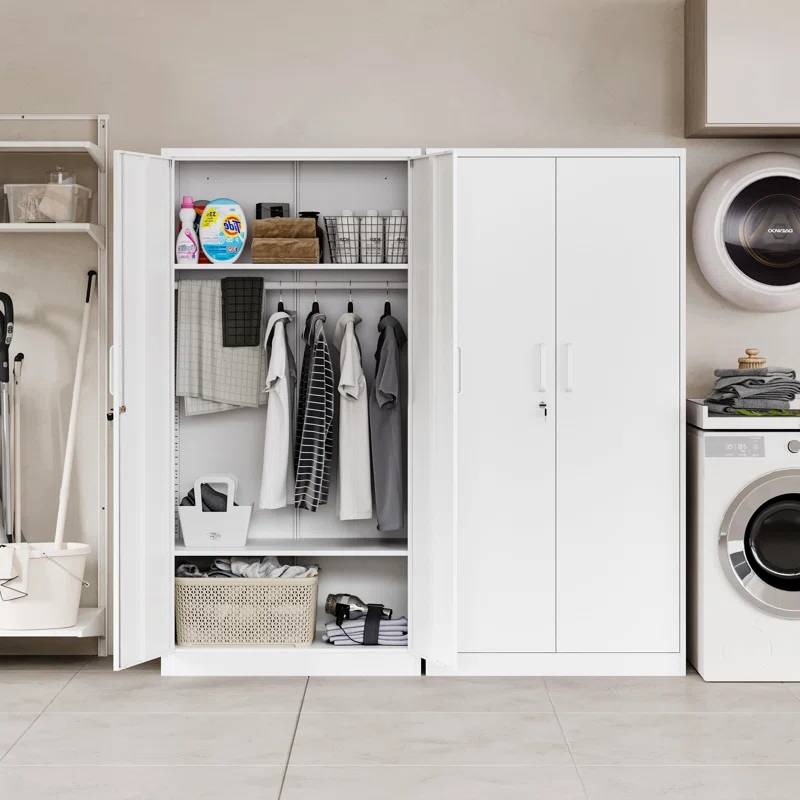 This White Metal Locking Wardrobe Armoire Cabinet with Clothing Hanging Rod is 72 inches high x 36 inches wide x 18 inches deep, perfect for storing household items in bathrooms, laundry rooms, bedrooms, etc.; use it in educational institutions, hotels, government agencies, fire stations, children's rooms, schools, gymnasiums, golf courses, museums and more.