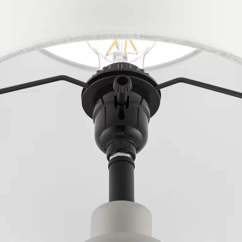 This lamp size is 10 in. W x 10 in. D x 14.05 in. H, which is finished in a mixed grey resin base. This Small Grey Desk Light Table Lamp with White Fabric Shade for Bedside Nightstand simple and modern design can be a good decoration for your living room or bedroom. It is using E26, 1 x 60-Watt type A not included. Enclosed manual makes it easy for you to install. It is not only a good choice for home decoration, but also an ideal gift choice for your family or friends on Christmas, Thanksgiving Day, birthday or housewarming. It can pass ETL certification.