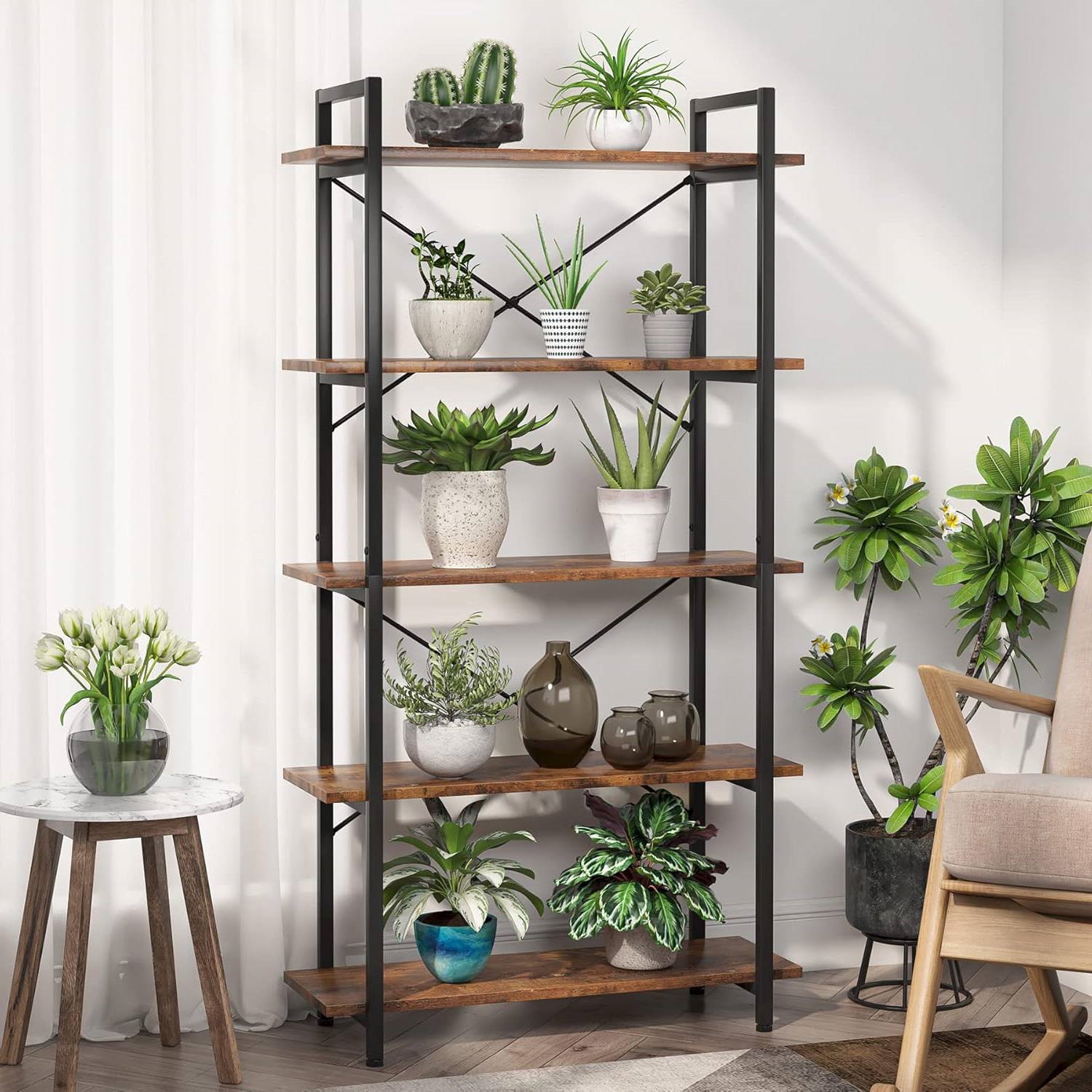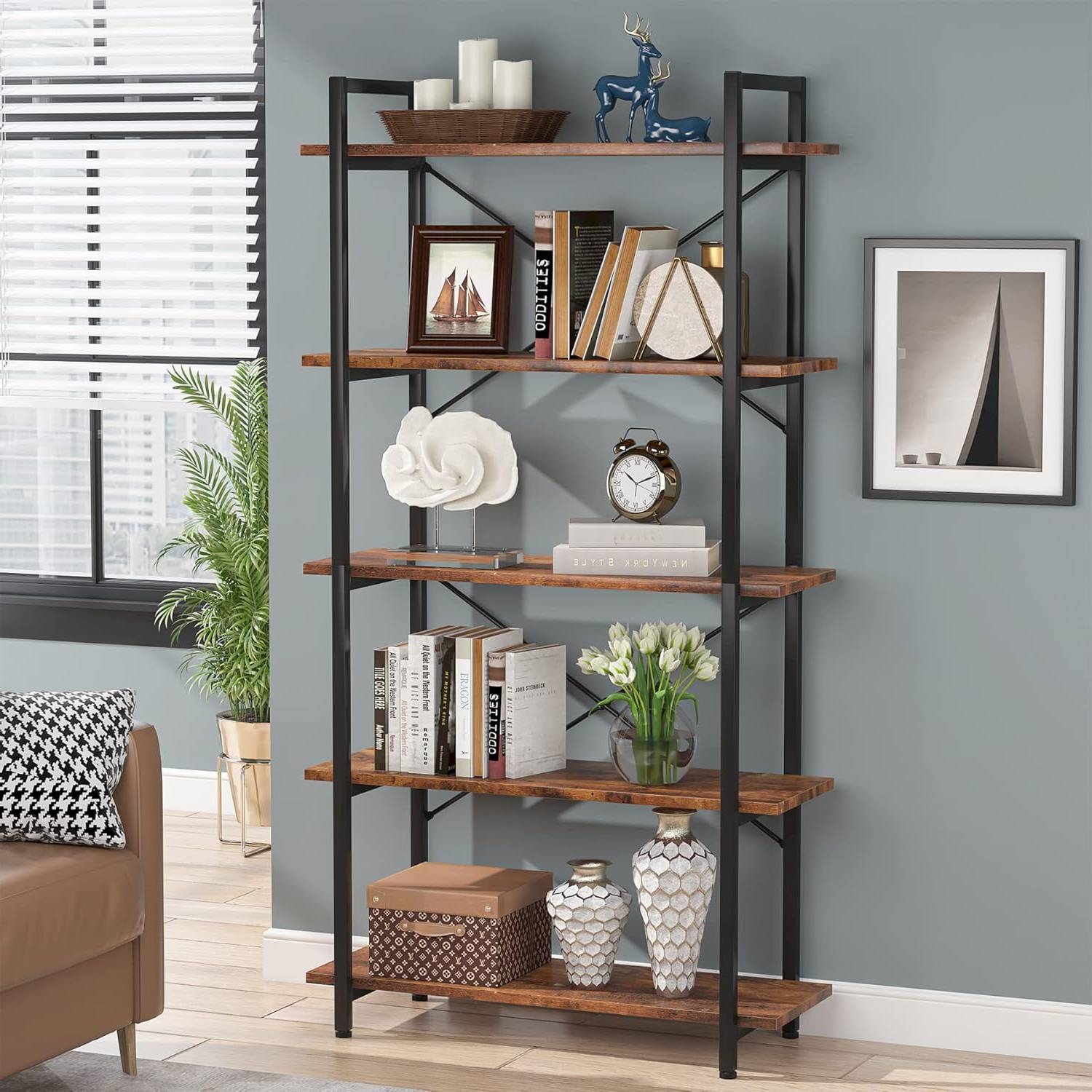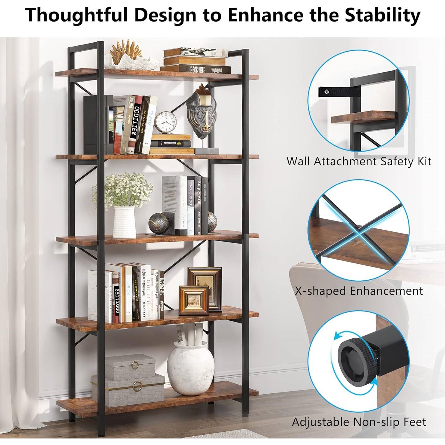 • Modern Industrial 5-Shelf Bookcase with Sturdy Metal Frame and Wooden Shelves