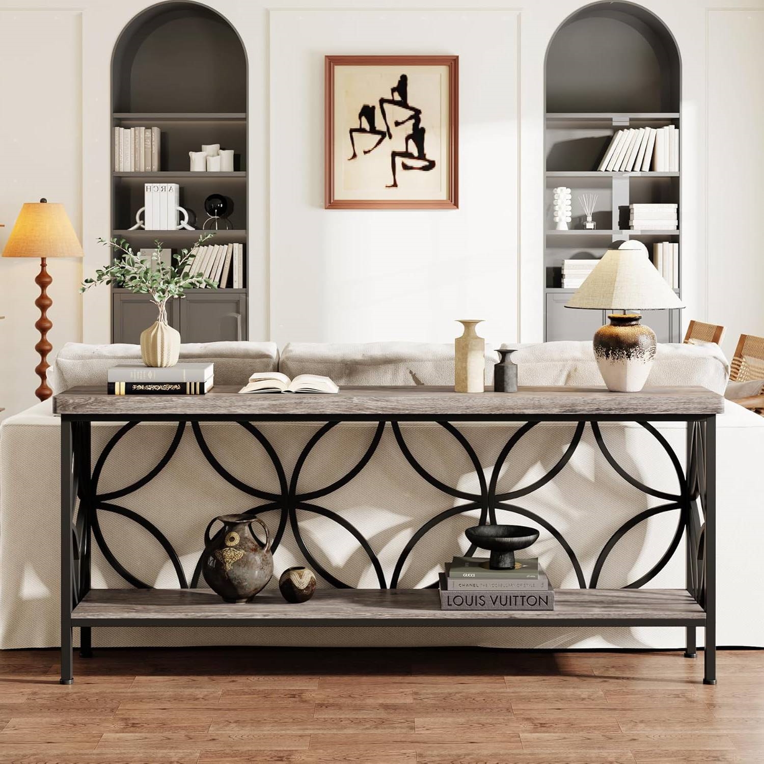 This Modern 70-inch Long Narrow Foyer Entryway Table with Grey Wood Top and Shelf features a vintage wood grain surface combined with black metal accents, creating an enduring pastoral look. The unique, artistic metal frame in the backdrop offers a contemporary yet artistic touch. This console table is as functional as it is stylish and can be seamlessly incorporated into your home decor. Whether used as a sofa table behind the couch for an enhanced seating area or as an entryway console table for captivating displays, it delivers an exceptional experience. Measuring 70.9"L × 11.8"W × 31.9"H, this elongated console table fits perfectly in narrow spots such as entryways or hallways. The 2-tier open shelf design offers plenty of room for display and storage without consuming much floor space. Made from high-quality particle board and steel, this slim console table boasts exceptional stability and longevity, with each shelf capable of holding up to 198 pounds. The adjustable foot pads are designed to accommodate uneven floors and prevent scratches. This entryway console table comes with detailed assembly instructions. All parts, tools, and instructions are included. We also offer an 18-month quality guarantee and lifetime professional customer service. Should you have any queries, feel free to reach out to us.