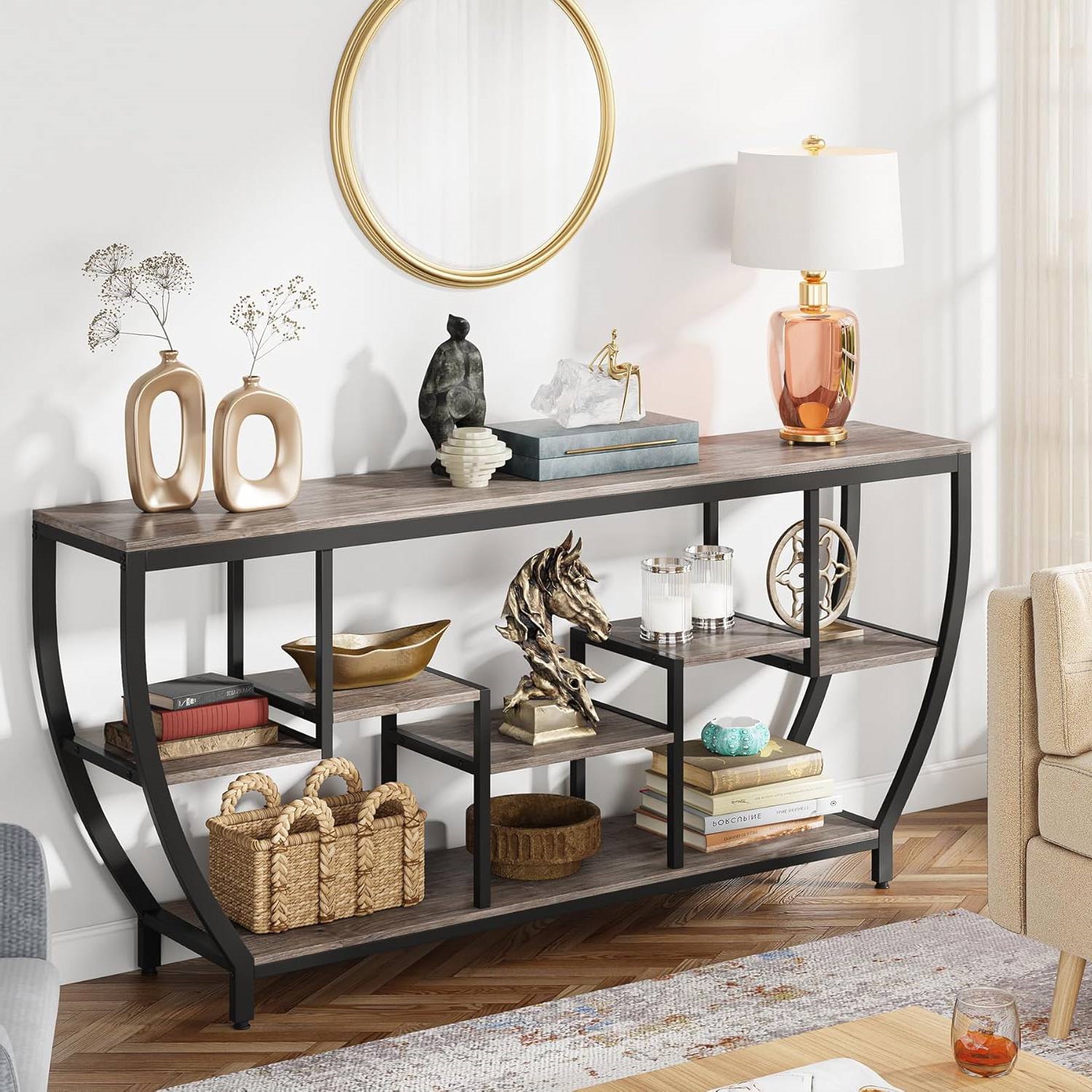 • Industrial Chic 70-inch Long Narrow Console Sofa Table with Gray Wood Shelves