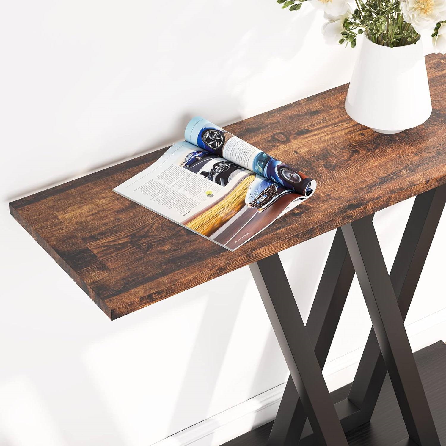 With its unique blend of black metal and retro finish, this Modern 43-inch Narrow Entryway Table with Brown Wood Top and Black Metal Frame brings industrial charm to any space. Our table boasts an innovative base with V-shaped tubes for an eclectic, eye-catching look, guaranteed to draw attention. Use it as a display table in the living room, an organizer in the entryway or a decoration stand in the hallway. Measuring 43.3" L x 11.8" W x 31.5” H, this table is perfect for limited spaces, offering a spacious platform for displaying items like books, lamps, and vases. Constructed of E1-graded MDF and powder-coated metal, this table can bear up to 300 lbs. It's enhanced by a 27.5" L x 11.8" W metal base for added stability. Our console table comes with clear instructions, hardware, and tools, allowing you to set it up in only 15 minutes and introduce a chic, retro atmosphere to your living space.