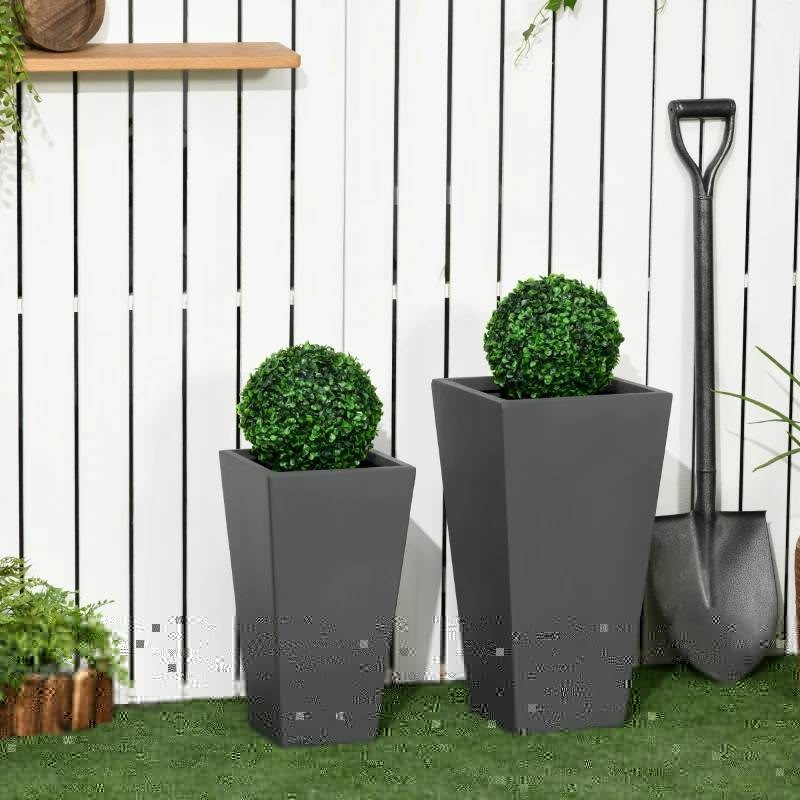 Grow Thyme!! This Set of 2 Modern Outdoor Flower Pot Planter Set in Grey makes a subtle yet functional accent piece with a stone-like look and modern shape. Extra tall design helps the roots of fiddle trees, fig trees, ferns, and much more. At home on the porch or patio, our outdoor flower pot has a nesting doll design, piquing interest wherever they're placed, and allowing for easier storage when the season is done. Stop worrying about waterlogging; the bottom drainage holes remove excess rain, managing moisture levels and keeping your flowers, trees, or other plants comfortable. Made of Magnesium Oxide, giving them a matte finish and stone-like look. This material doesn't mind UV or rain, allowing for a more durable and lightweight planter overall. Larger Planter Dimensions: 11.75" L x 11.75" W x 21.75" H. Smaller Planter Dimensions: 9.75" L x 9.75" W x 17.75" H. Weight Capacity: 220 lbs., 154 lbs. No assembly required.