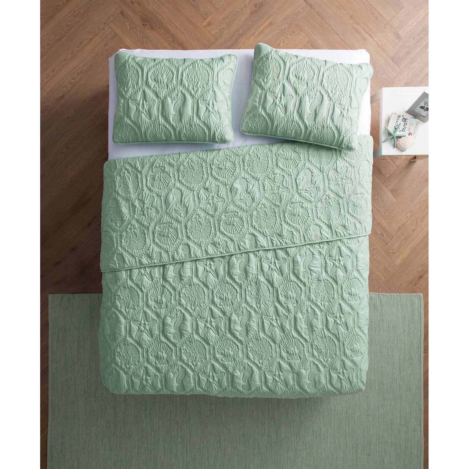 This Queen Coastal Beach Starfish Seashell Seahorse Light Green Teal Quilt Set has everything you need to bring a cool, coastal vibe to your space all year long. Featuring a subtle embossed sea life pattern, the set includes coordinating shams for a complete staycation-worth look.