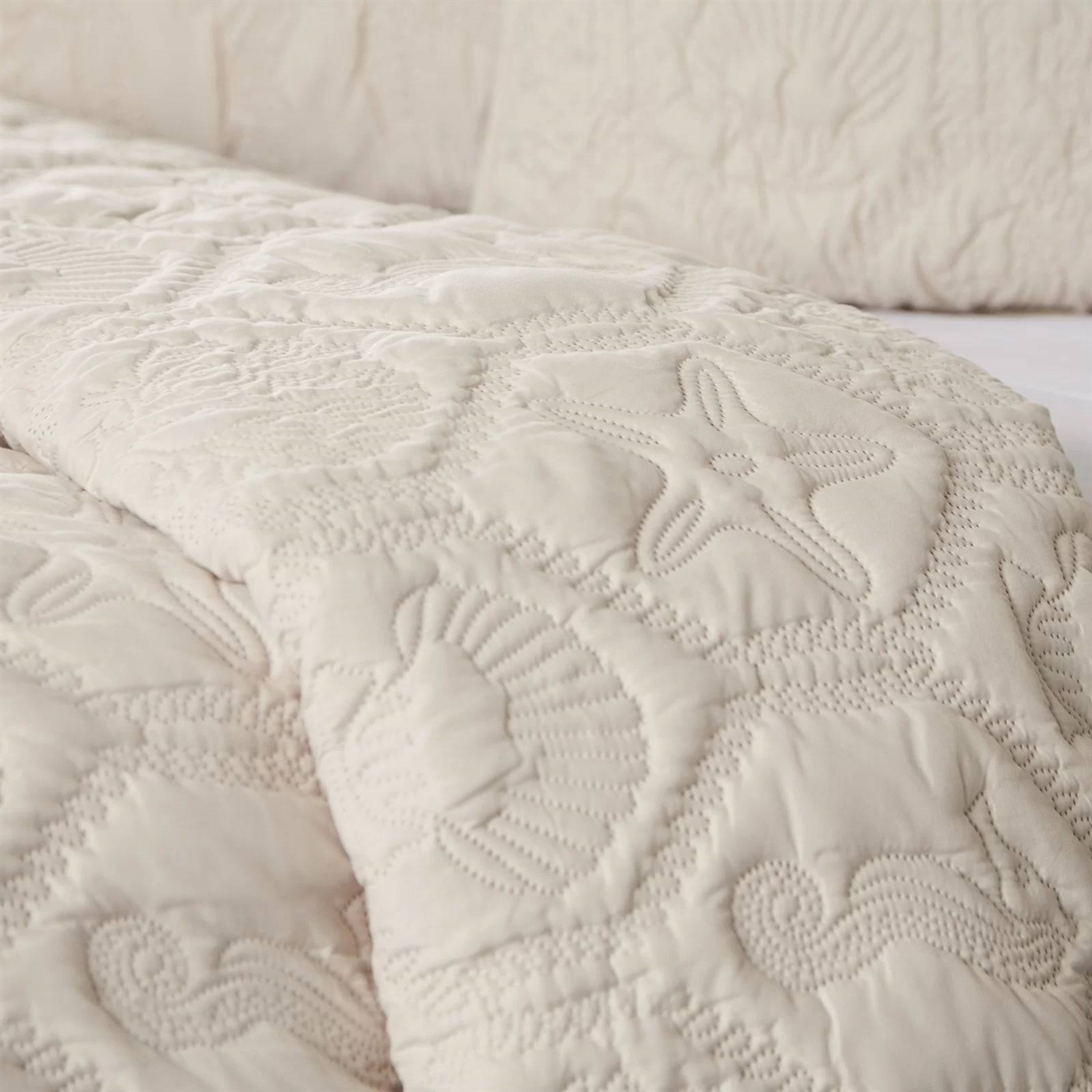 This Queen Coastal Beach Starfish Seashells Seahorse Sand Tan 3-Piece Quilt Set has everything you need to bring a cool, coastal vibe to your space all year long. Featuring a subtle embossed sea life pattern, the set includes coordinating shams for a complete staycation-worth look.